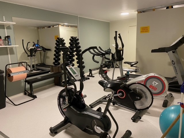 Finns i källarplan och kan bokas alla dagar via bokningstavla vid motionsrum. Max 1 timme/gång. I motionsrummet finns löpband, motionscykel, airbike, roddmaskin, hantlar mm.